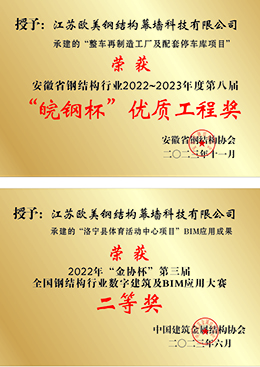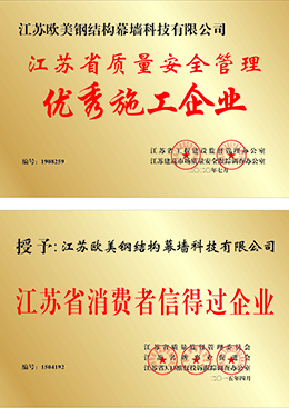 江蘇歐美鋼結構幕墻科技有限公司鄭州分公司是集團按全國發展規劃部署要求,特在鄭州設立的分公司。本公司前身為八一網架集團有限公司,隸屬于解放軍 總后勤部,成立于1956年,2006年企業改制成立江蘇歐美鋼結構科技有限公司,是住建部核定的鋼結構工程承包壹級、建筑幕墻工程承包壹級、建筑裝飾裝修工程承包貳級、金屬門窗工程承包叁級、地基與基礎工程承包叁級。同時兼有鋼結構,幕墻,裝飾工程三項甲 級設計資質。是一家集鋼結構、建筑幕墻、金屬門窗、地基與基礎及建筑裝修裝飾為一體的大型綜合性建筑企業。